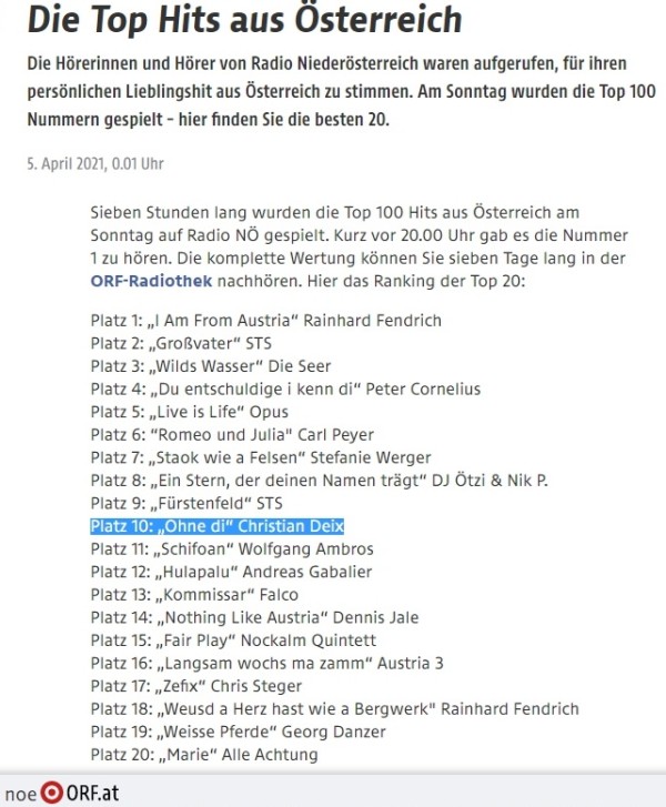 Bei der Wahl der 100 Top Hits aus Österreich haben die Hörer*innen von Radio Niederösterreich "Ohne di" auf den sensationellen 10. Platz gewählt. Damit ist "Ohne di" der bestplatzierte Newcomer-Song in der Gesamtwertung.